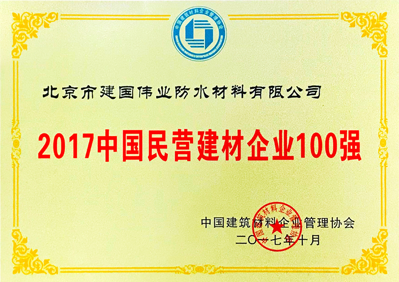 中國建筑材料企業(yè)管理協(xié)會于2017年10月26日在北京召開了2017年度中國建材企業(yè)500強(qiáng)、建筑服務(wù)業(yè)100強(qiáng)、民營建材企業(yè)100強(qiáng)和最具成長性建材企業(yè)100和園區(qū)20強(qiáng)暨防水技術(shù)交流會,來自全國各地的近千余名會員代表出席了會議。會議上,建國偉業(yè)榮獲“2017中國民營建材企業(yè)100強(qiáng)”稱號。